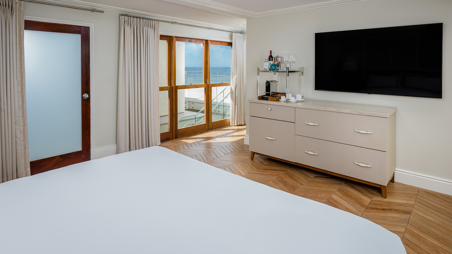 Breathe in the fresh sea-air from the private balcony of your Oceanfront Corner Studio – your spot above the sand – with a king-sized bed, indulgent soaking tub, and unending views of sea and sky.