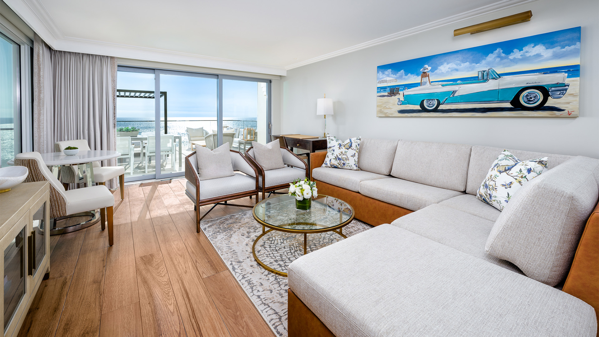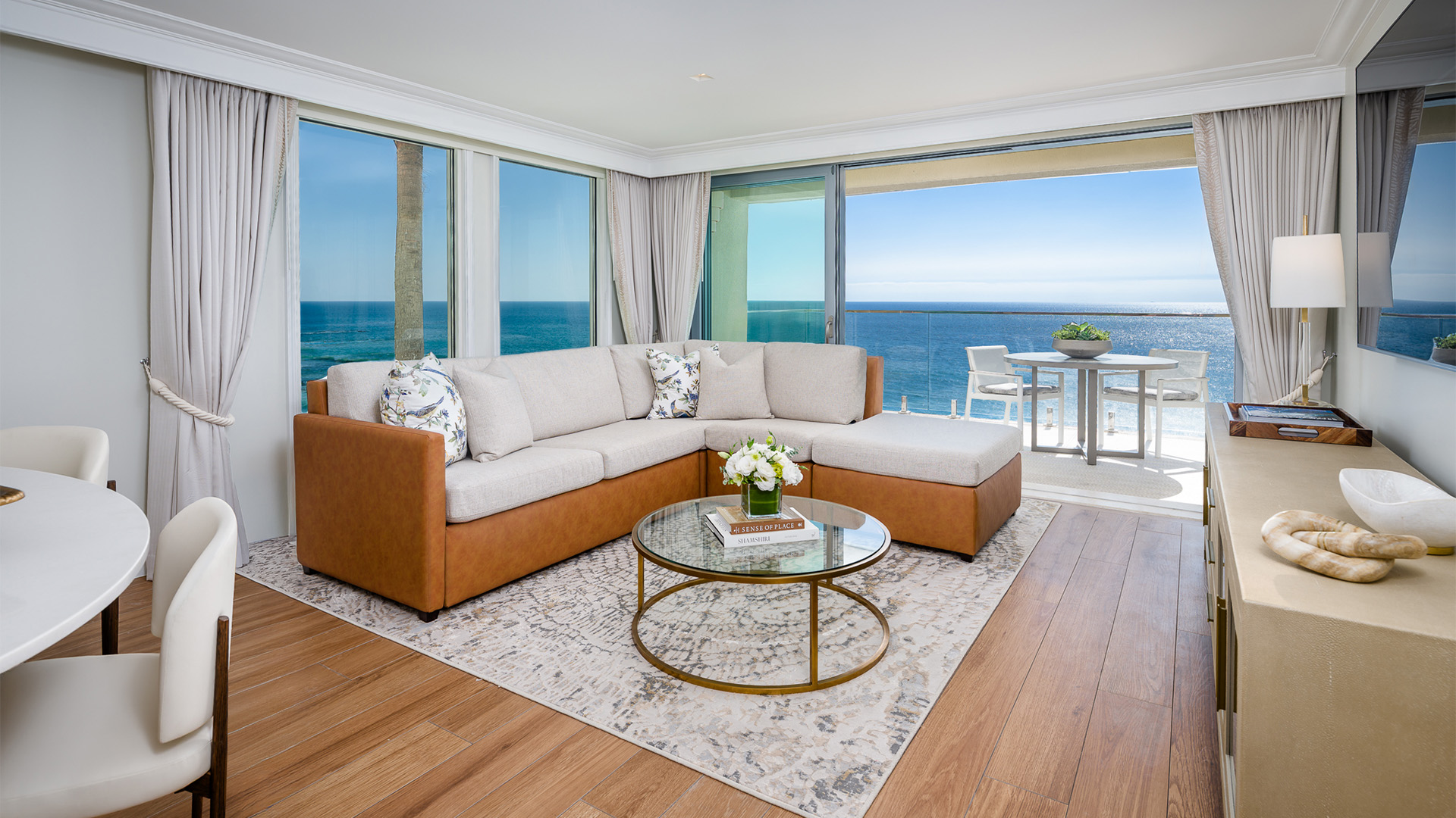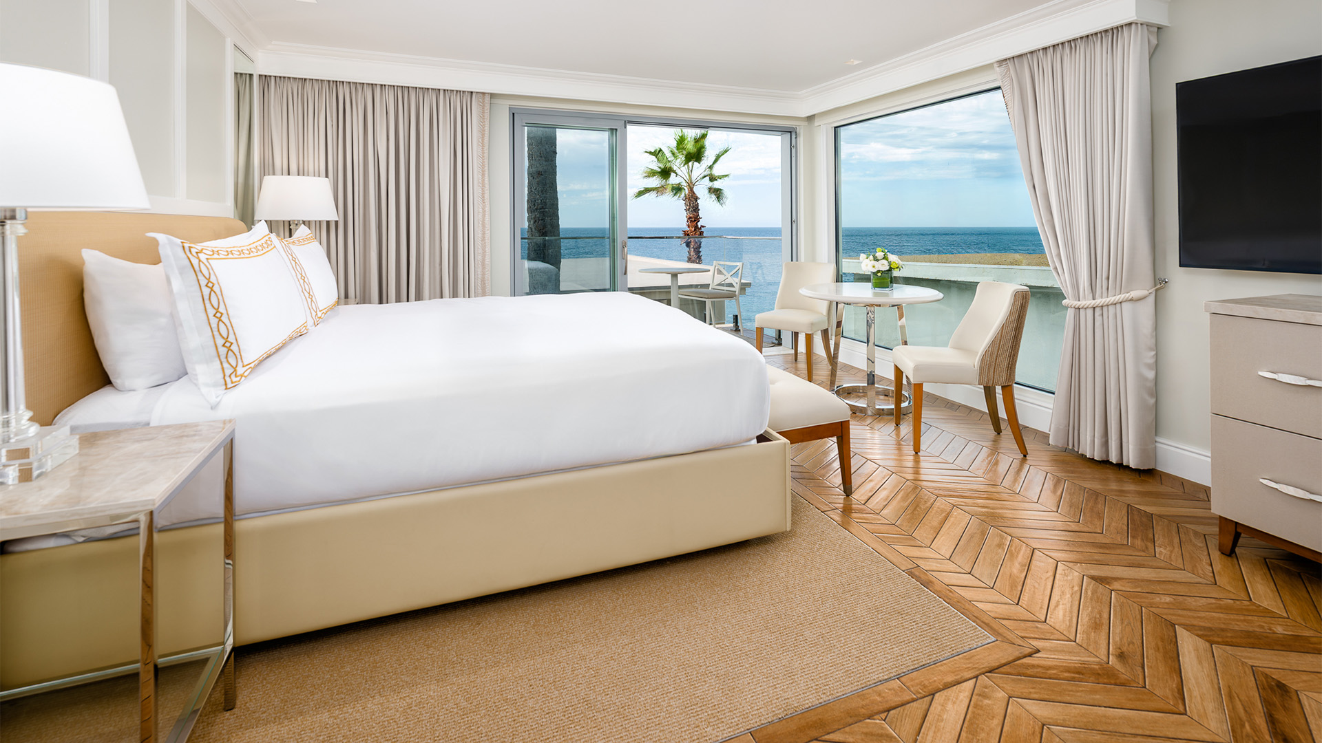 Step out onto your glass-enclosed balcony and be met with panoramic views of the Pacific. Styled as a private coastal escape, this expansive suite features a sumptuous king bed and sleeper sofa.