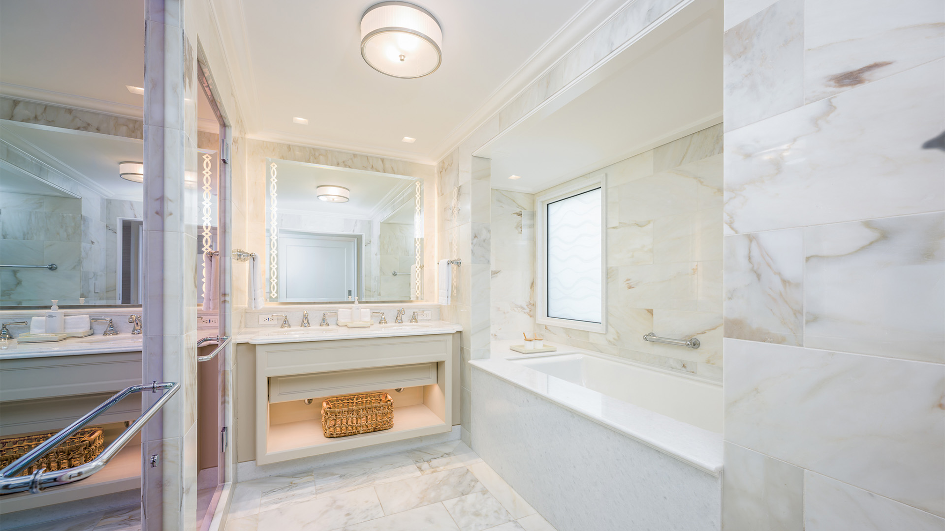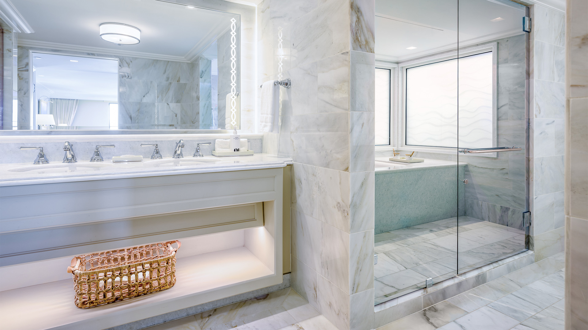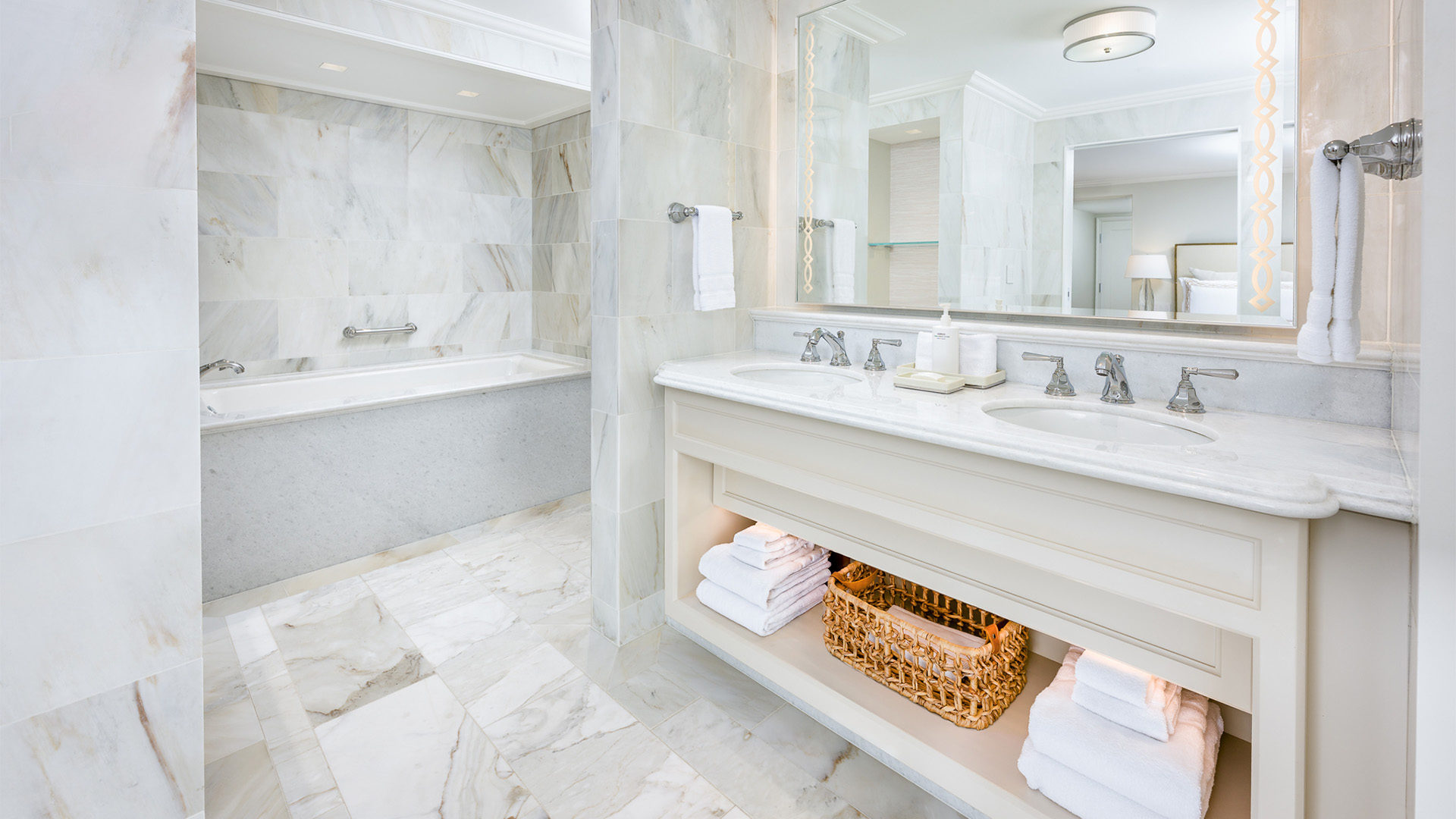 This generously-designed suite is complete with its own living room, king-sized bedroom and a bathroom akin to a private sanctuary, where you'll find a soaking tub, spa-like shower and double vanity.
